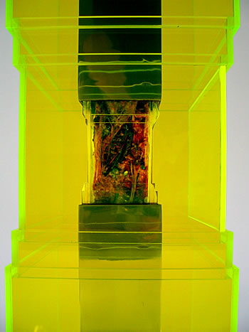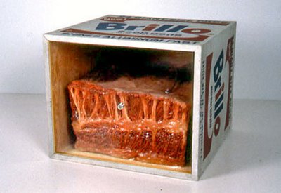 Una visita recent a Madrid em va portar al “Museo Nacional Centro de Arte Reina Sofía” on vaig descobrir un artista americà que no habia vist (o no recordo haber vist) abans i que basa gran part de la seva obra escultòrica en la simulació de peces del cos humà o d’animals i la seva conservació en recipients de plàstic com si d’uns reliquiaris religiosos es tractesin. Aquesta obsesió per la carn, la decadència i la lletgesa, contrasta amb la pulcritut de les seves exhibicions. Els seus objectes es situen en espais nets i blancs per ser observats sense distraccions. Es inevitable apreciar l’engany i sentir el to burleta de l’artista però també corprén el dramatisme de la vanalitat de la nostra existència que supura de cadascuna de les seves obres.