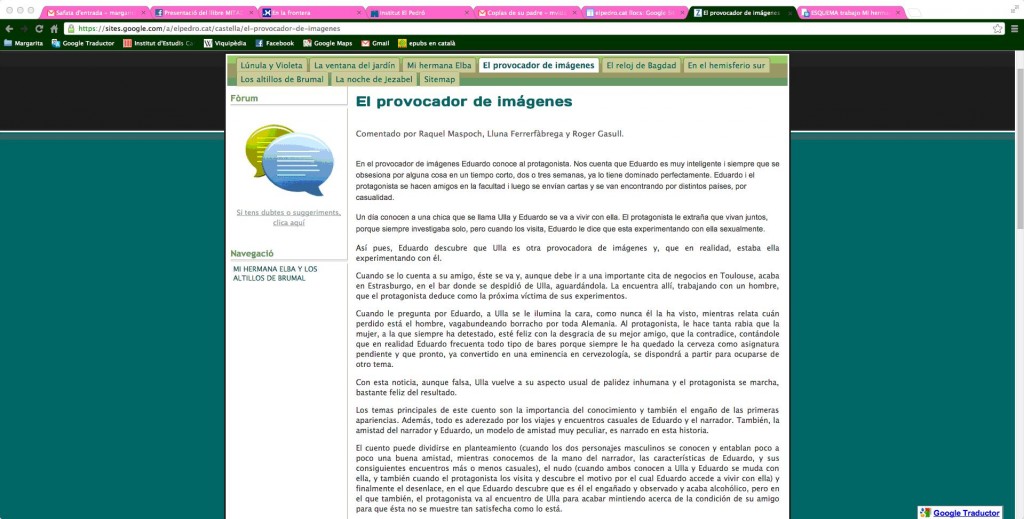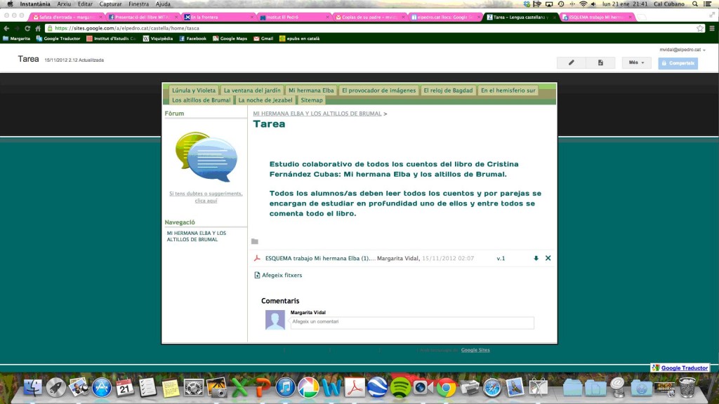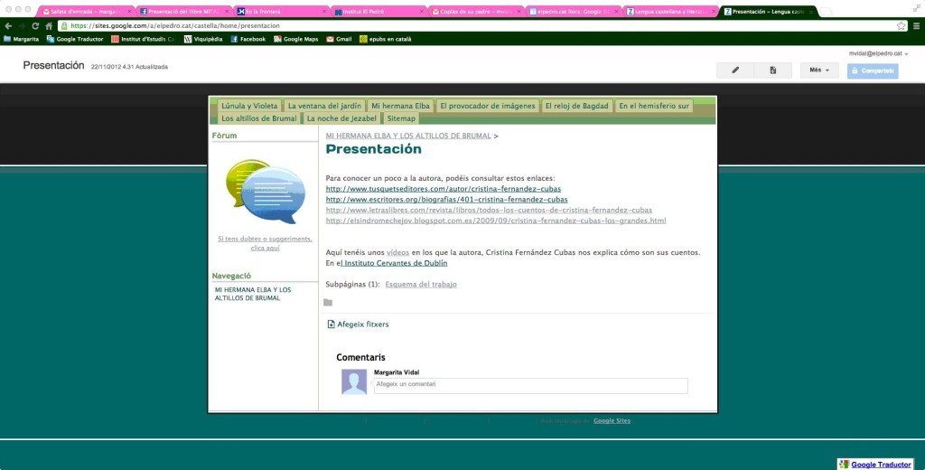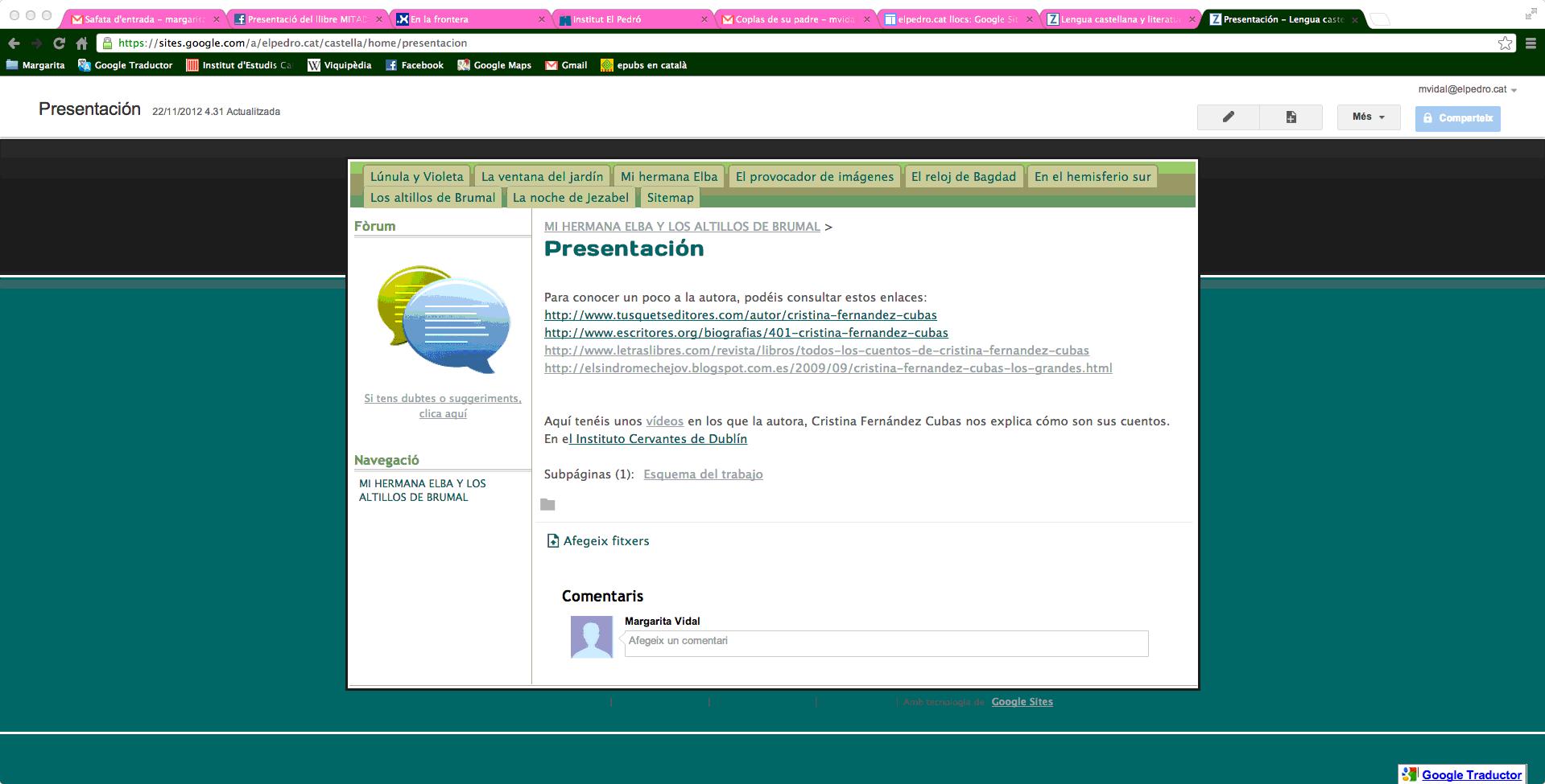 Tras una lectura completa individual de toda la obra, realizada en casa durante el mes de octubre, creamos un google sites del grupo para poder realizar el trabajo colaborativo. Primero les puse una presentación con la tarea, con un PDF del esquema que se debía seguir para trabajar cada cuento y los enlaces a unas páginas web que podían consultar en casa para obtener información sobre la autora y sus obras.