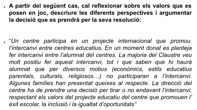 Vam debatre sobre el dilema i vam concloure que s’hauria de tenir en compte el PEC i valors/ideals del centre, per decidir si aquesta és una activitat adient en aquest centre. En qualsevol cas, i sempre comptant amb un ampli suport (caldria fer una consulta prèvia), si finalment es tira endavant, també caldria cercar solucions a les diferents dificultats trobades, ja siguin de tipus econòmic, cultural o altres, dialogant de manera permanent amb les famílies per intentar cercar solucions, sense deixar evidentment, cap alumne sense atendre.