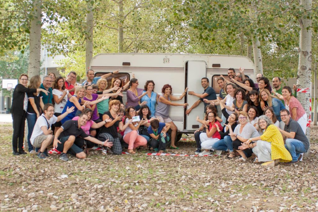 El claustre de professors de l’Institut La Plana, amb la caravana de fons, donà la benvinguda al curs 2018-2019.