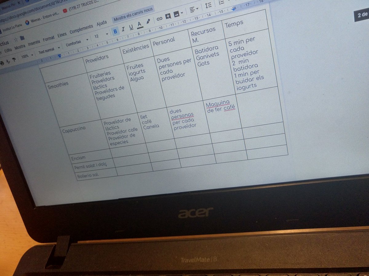 Els alumnes de l’optativa d’Economia i empresa de 4t d’ESO van a bon ritme. En aquesta ocasió, en la sessió 7 de treball, estan elaborant un pla de recursos i materials necessaris; així com propostes de distribució de cadascun d’ells.