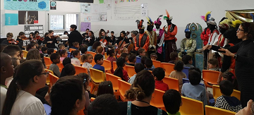 Els patges ens visiten i cantem acompanyats de músics de l’institut. Clica sobre la foto i ens sentiràs afinar!