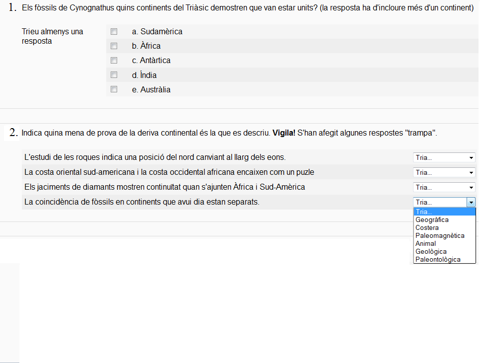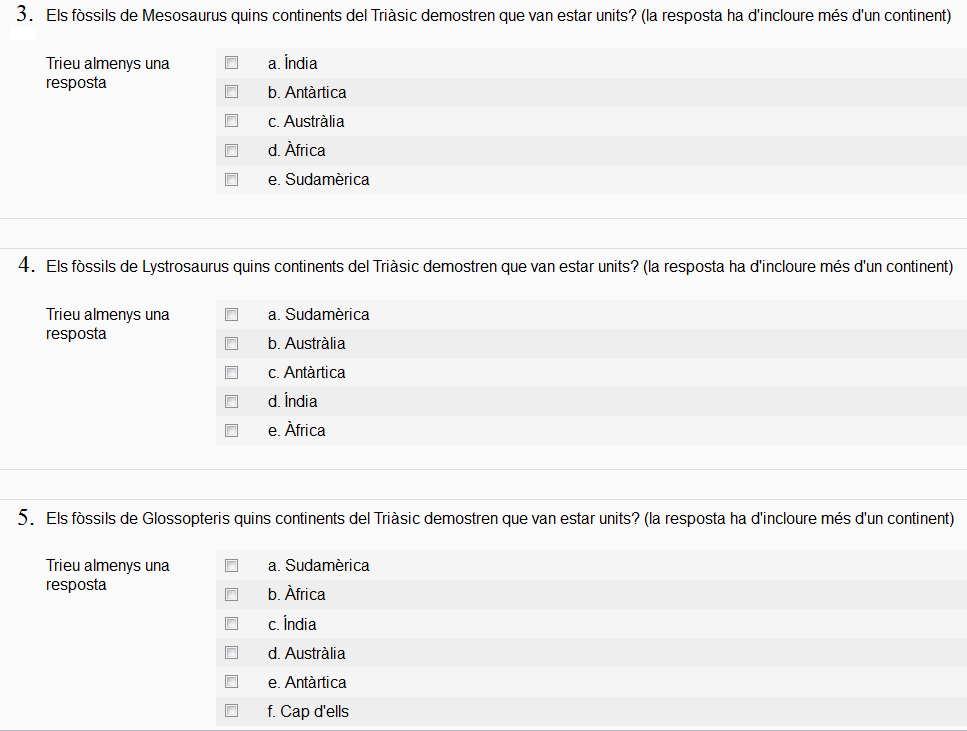 - Qüestionari al voltant de les proves aportades per Wegener de la deriva continental. Es recomana als alumnes de visitar la pàgina de la Viquipèdia sobre el Mesosaurus. Les preguntes les podeu veure fent clic a les miniatures: