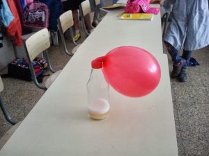 A LES AMPOLLES QUE VAU PORTAR HEM POSAT VINAGRE I DINS UN GLOBUS, AMB L’AJUDA D’UN EMBUT, HEM POSAT BICARBONAT… AL POSAR LA BOCA DEL GLOBUS A LA BOCA DE L’AMPOLLA… XA XAN… EL GLOBUS S’HA INFLAT QUAN EL BICARBONAT HA TOCAT EL VINAGRE!!!