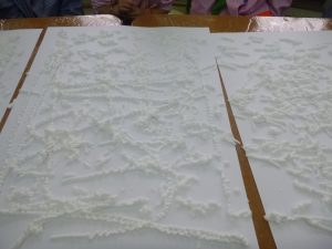 VAM PREPARAR UNES CARTOLINES BLANQUES I A SOBRE HI VAM TIRAR L’ESCUMA D’AFEITAR BLANCA. DESPRÉS VAM TRIAR COLORS DELS COLORANTS ALIMENTARIS I EL VAM TIRAR PER SOBRE DE L’ESCUMA. LLAVORS, AMB LES MANS VAM REMENAR L’ESPUMA JUNT EL COLORANT I VAN VEURE COM L’ESCUMA CANVIAVA DE COLOR…