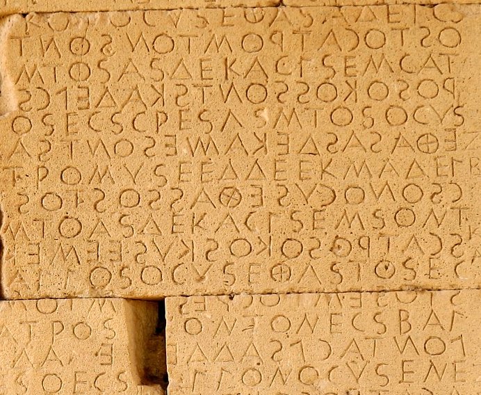 Al segle V aC es va inscriure el text de la imatge. Està escrit en grec i i els signes són els de l’alfabet que els grecs van crear a partir del fenici. Els que coneixeu aquest alfabet hi podreu reconèixer algunes de les seves lletres: èpsilon, kappa, òmicron, alfa, tau, theta, mi, beta, delta… I potser us cridaran l’atenció algunes coses més… Si és així, sou convidats a escriure un comentari sobre tot plegat amb les vostres observacions.