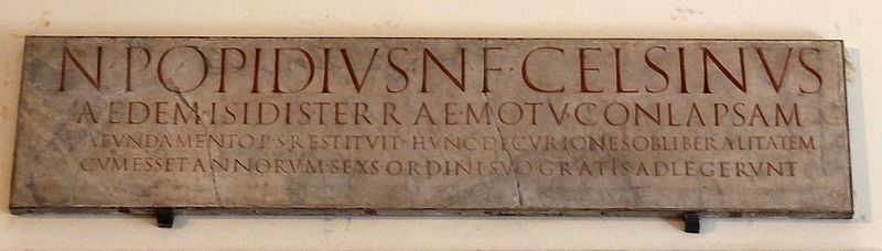 N(umerius) · Popidius · N(umerii) · F(ilius) · Celsinus | Aedem · Isidis · terrae · motu · conlampsam | a · fundamento · p(ecunia) · s(ua) · resituit · hunc · decuriones · ob liberalitatem | cum · esset · annorum · sexs · ordini · suo · gratis · adlegerunt