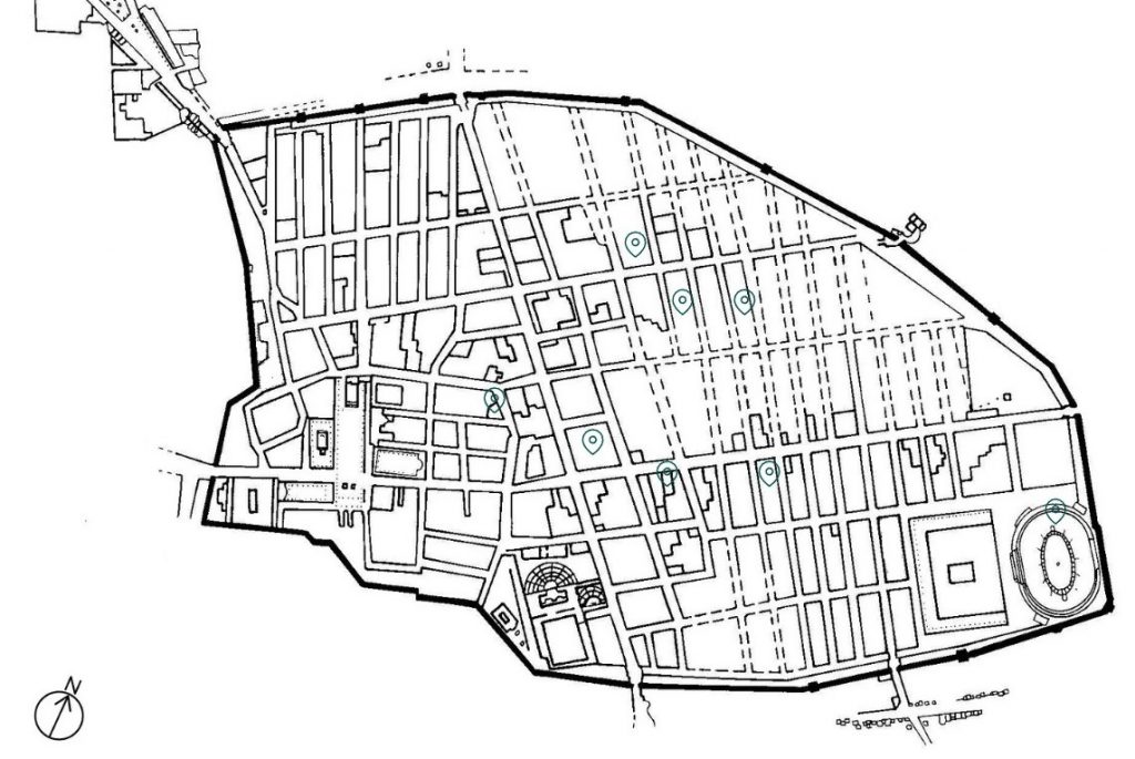 El mapa de Pompeia a la nostra pàgina web. Dins de cada ubicació marcada hi trobem una inscripció.