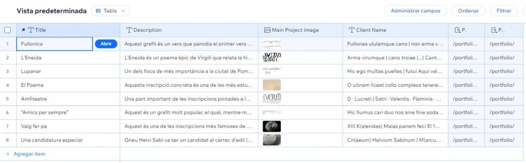 CMS de les pàgines dinàmiques del mapa de Pompeia, vist en format taula de continguts.