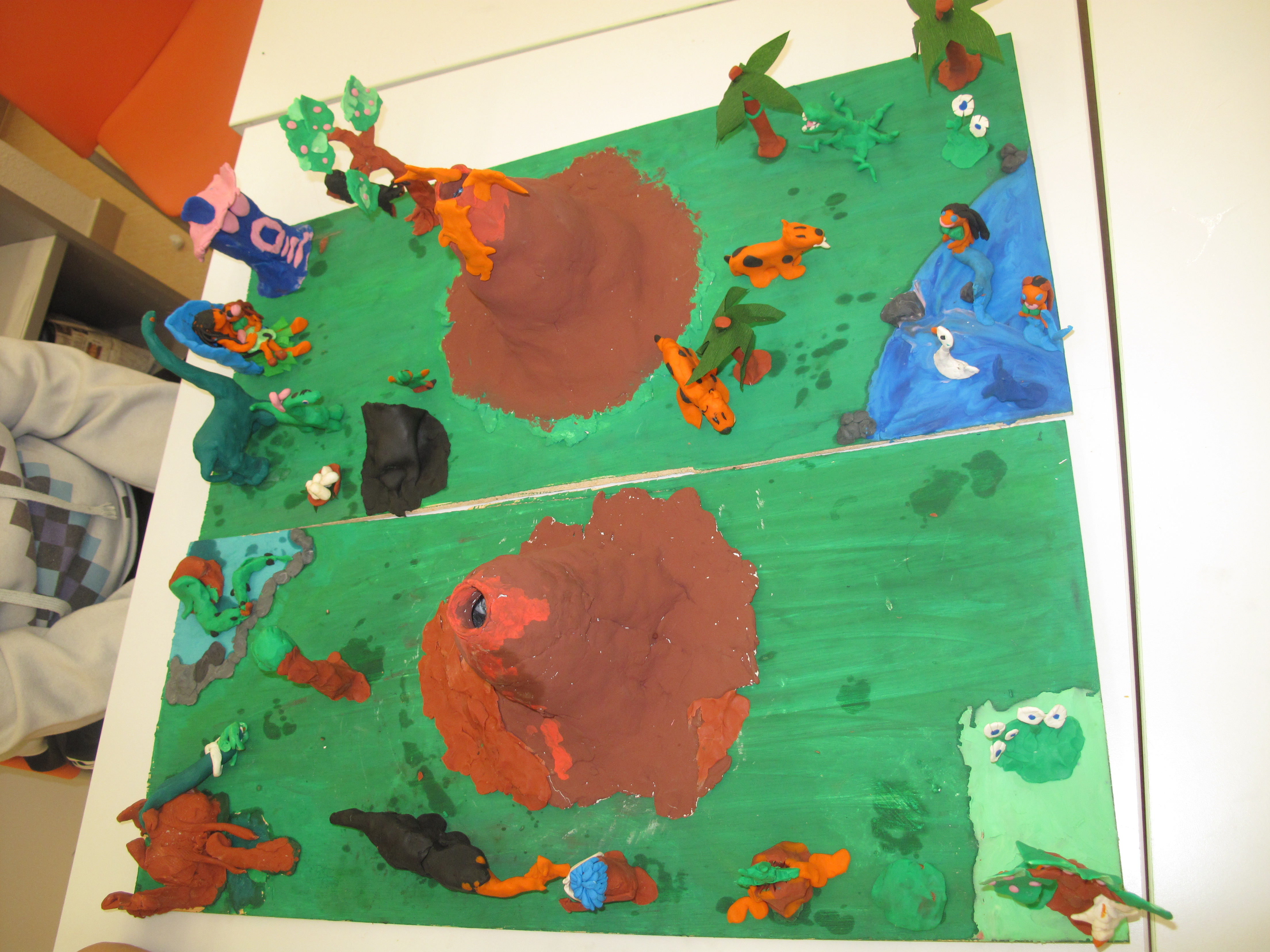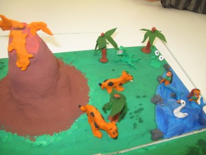 Primero hicimos la maqueta en una madera, y pusimos una botella para hacer la forma del volcán y lo recubirmos de barro. Con plastelina y otros materiales hicimos animales (monos, patos..) y personajes (elfos, sirenas, una tribu…) Cada maqueta cuenta una historia. La idea es era hacerlo explotar después, y lo hicimos llenando el volcán de bicarbonato y luego añadiendo una mezcla de vinagre y colorante rojo. Ha sido muy chulo.