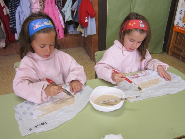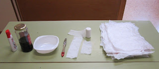 En una mica de cola afegir una mica d’aigua i cafè soluble .Col.locar els rectangles de gases sobre el full de plàstic i aplicar damunt la preparació cola +cafè. Deixar assecar .Després desenganxar amb atenció el papir del full de plàstic. Les irregularitats dels vores i el color fan la sensació de tenir un autentico papir.