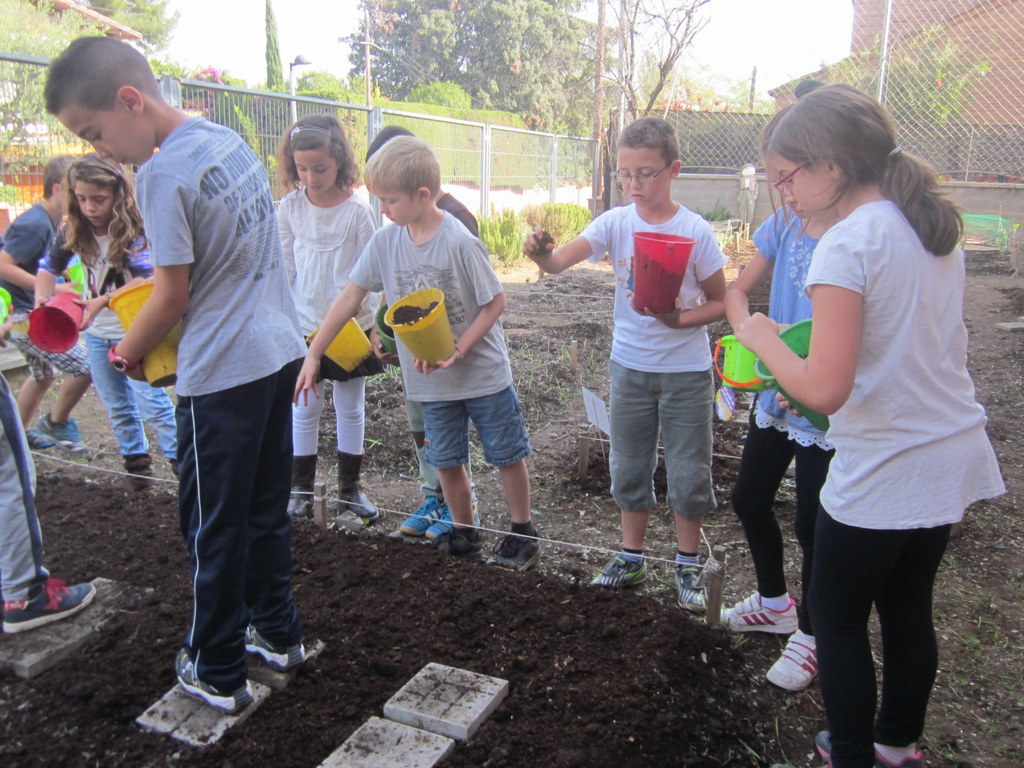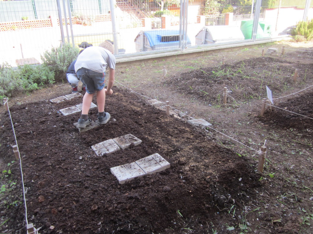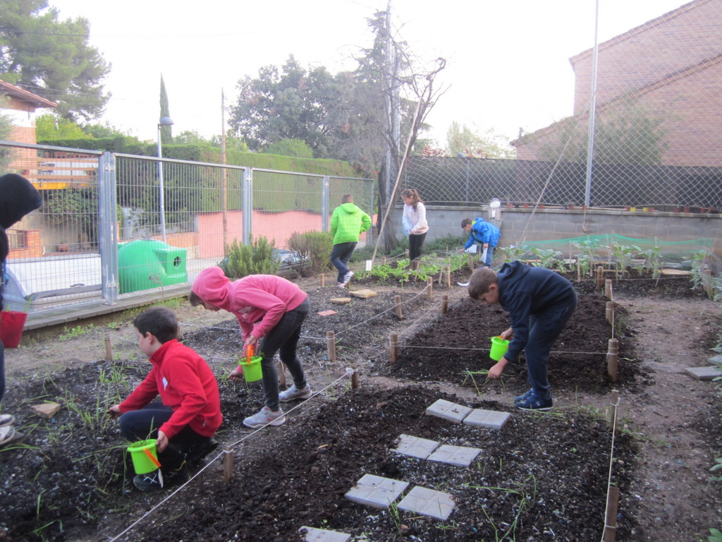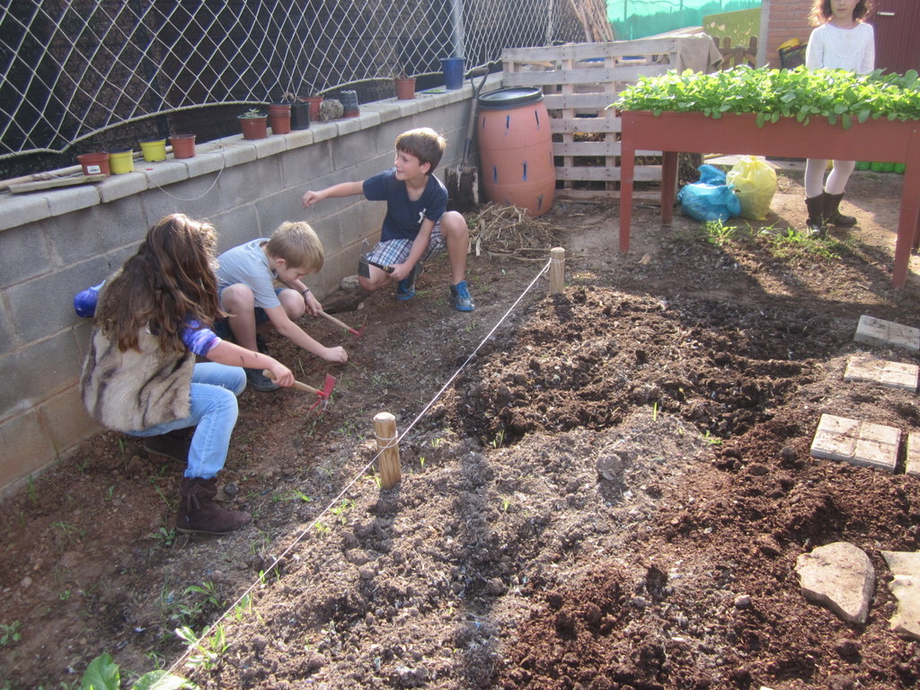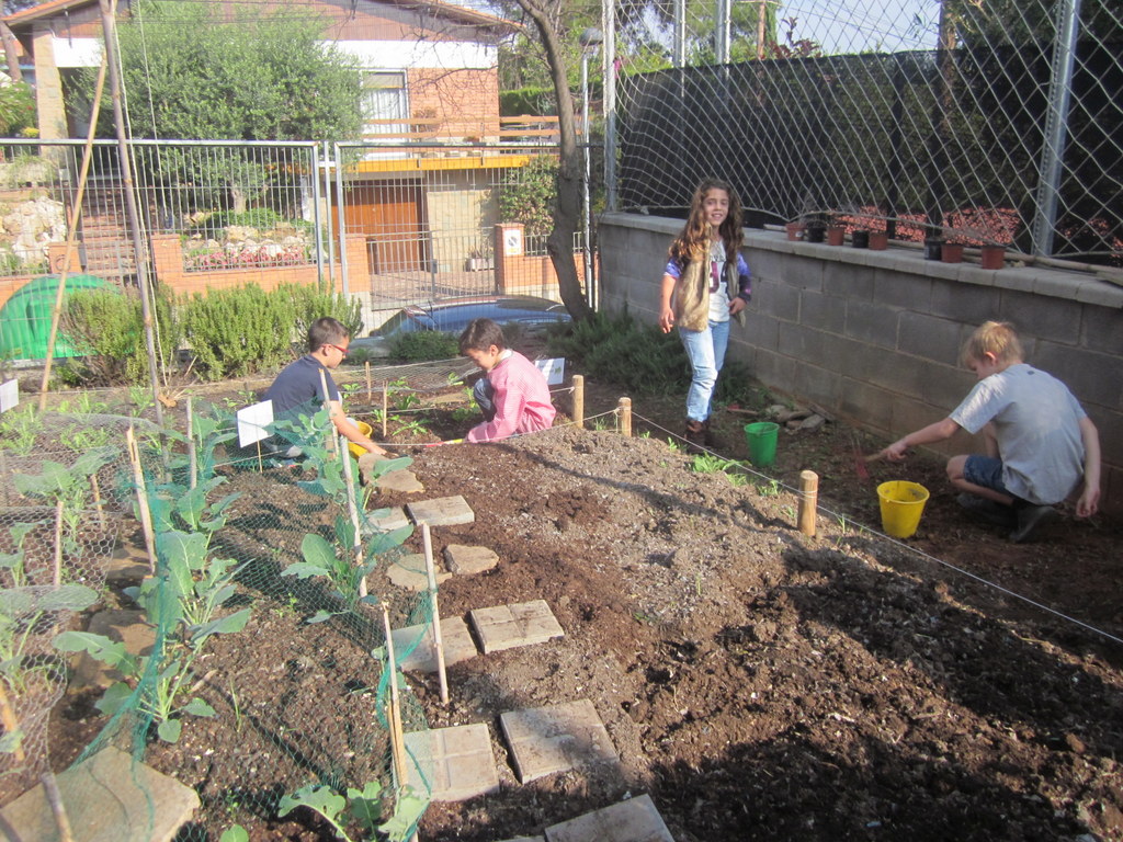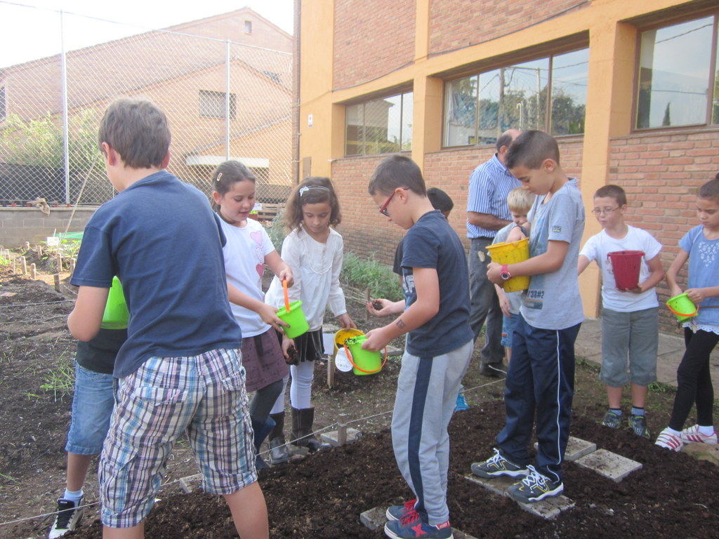Amb una fanga de doble mànec hem remogut la terra. Cada nen hem mogut una mica de terra amb la fanga perquè respiri. Els cucs de terra també ajuden a respirar la terra. Hem posat closca d’ou als bròquils. Hem plantat bledes de planter i de llavor. Hem regat sense mullar les fulles. I hem arrencat males herbes.