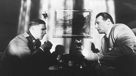 L’enaltiment de Shindler i la seva superioritat fins i tot davant del més temible oficial alemny queden palesos aquí. En el seu “tête à tête” el punt de vista de Shindler és més alt, té una actitud més relaxada i està més il·luminat que l’oficial alemany. D’altra banda, la franja d’ombra que els separa sembla confirmar que no estan del mateix bàndol. I així és, Shindler, membre del moviment nazi en un principi aprofita, per a la seva fàbrica, la ma d’obra barata dels jueus provinents del ghetto de Cracòvia. Però el seu punt de vista canviarà i la seva finalitat esdevé salvar els seus treballadors dels camps de concentració. Al llard de la seva relació amb Amon Goeth, el cap del comando de Austchwitz, el domina i l’utilitza per a finaltats contràries als del moviment nazi.