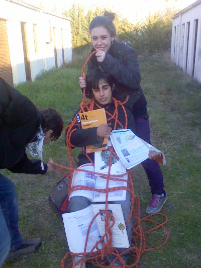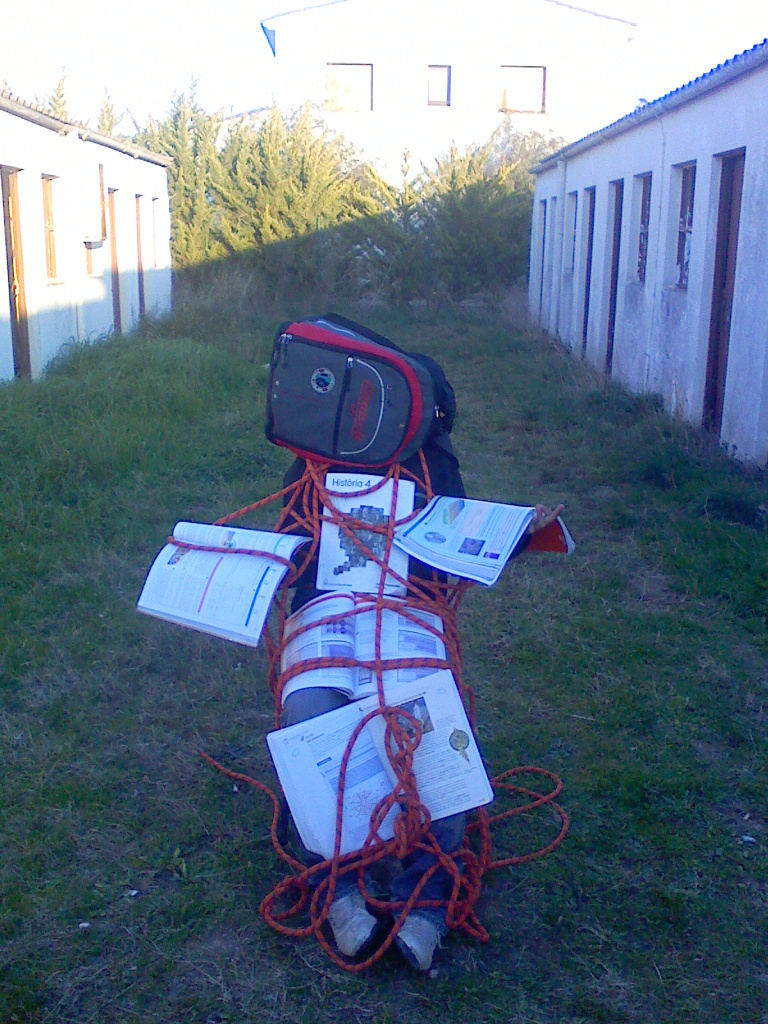 Aquest noi amb la motxilla al cap, representa tot el col·lectiu d’estudiants d’ESO. La cadira simbolitza l’institut, la posició d’estudi, El noi està lligat de cap a peus amb els seus llibres de text, saturat de deures. També és una protesta contra el caràcter obligatori de l’ESO.