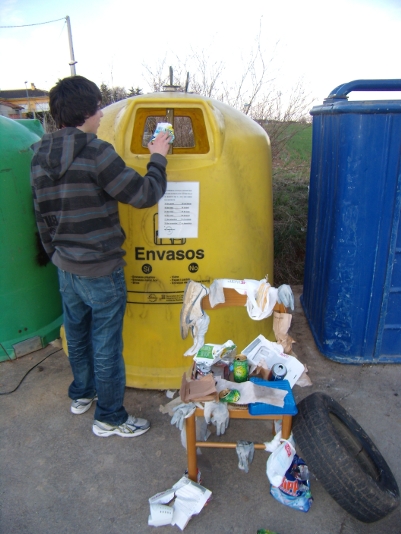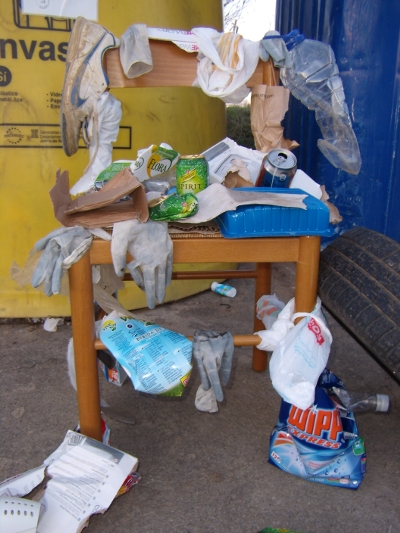 Amb un petit gest, podem ajudar a tenir un món més net. La cadira representa  la societat moderna de benestar on es produeix molta brutície.