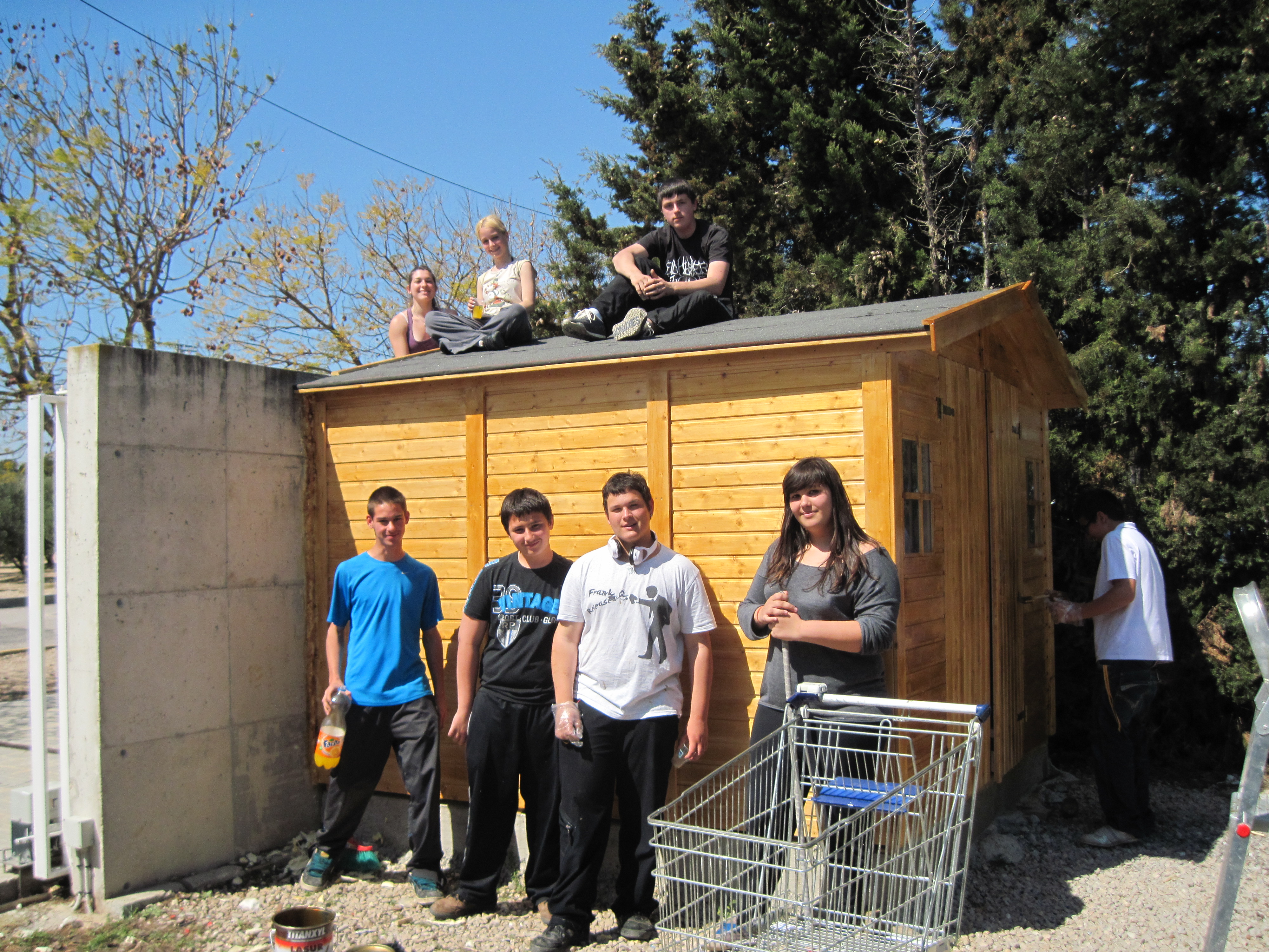 Aquí els alumnes de l’aula oberta, vam acabar de pintar la caseta de les eines de treball i el tutor ens va portar una beguda refrescant para agrair-nos el nostre treball. |