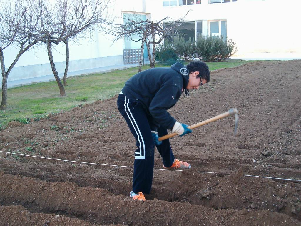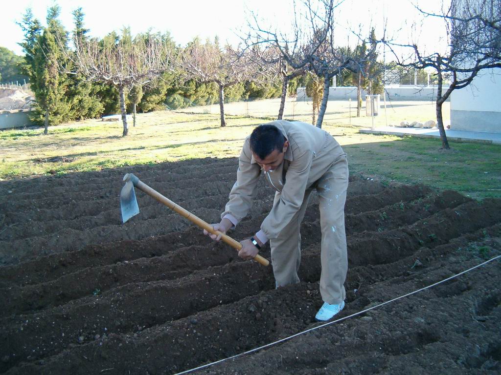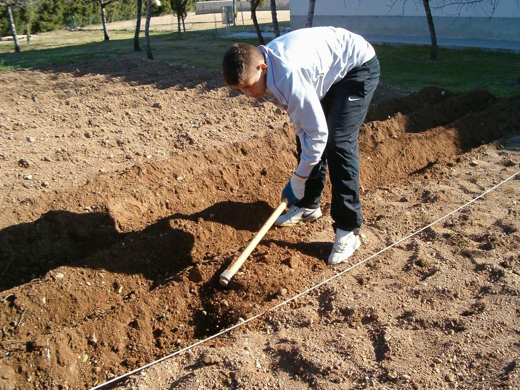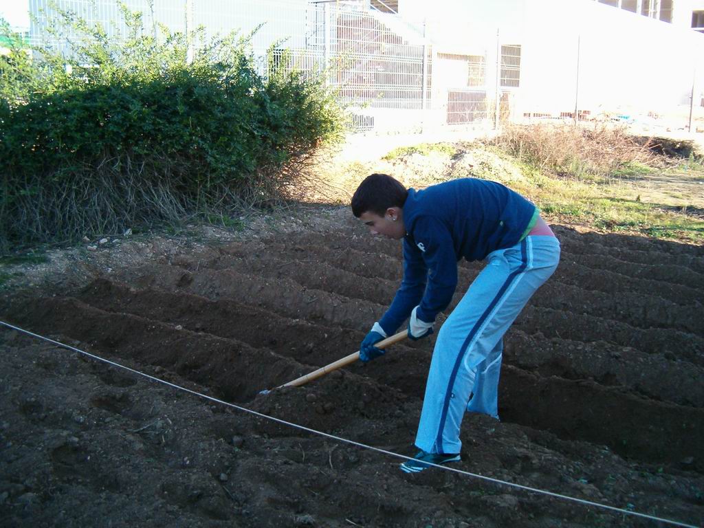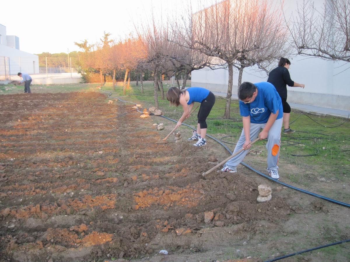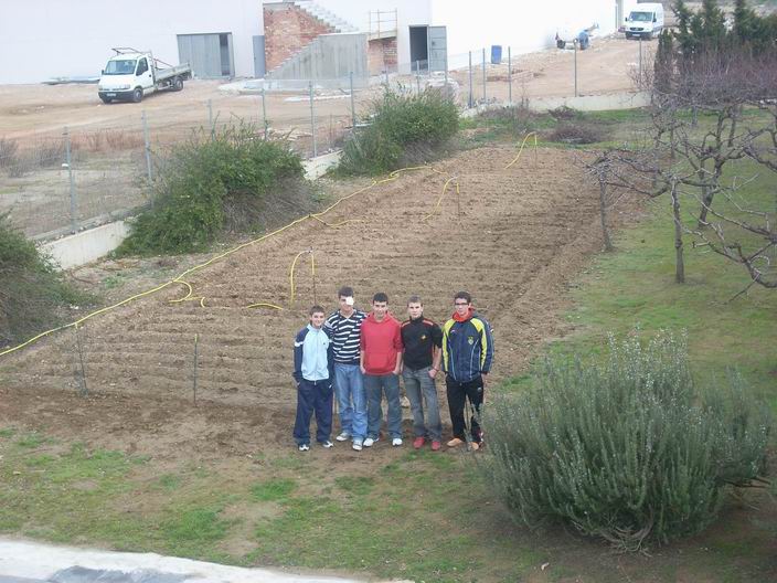 Aqui estan Dani G. al fons Jordi i Laia refent els solcs amb les aixades per poder regar bé el planter quant el plantem. |