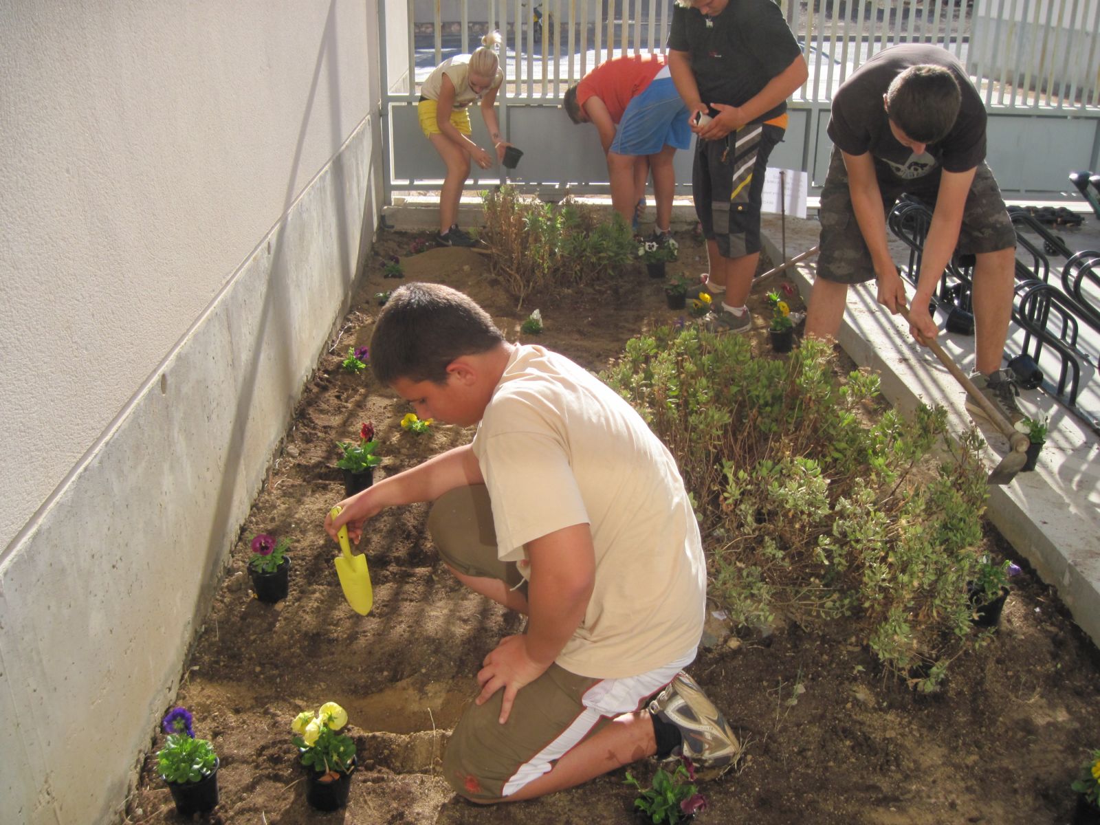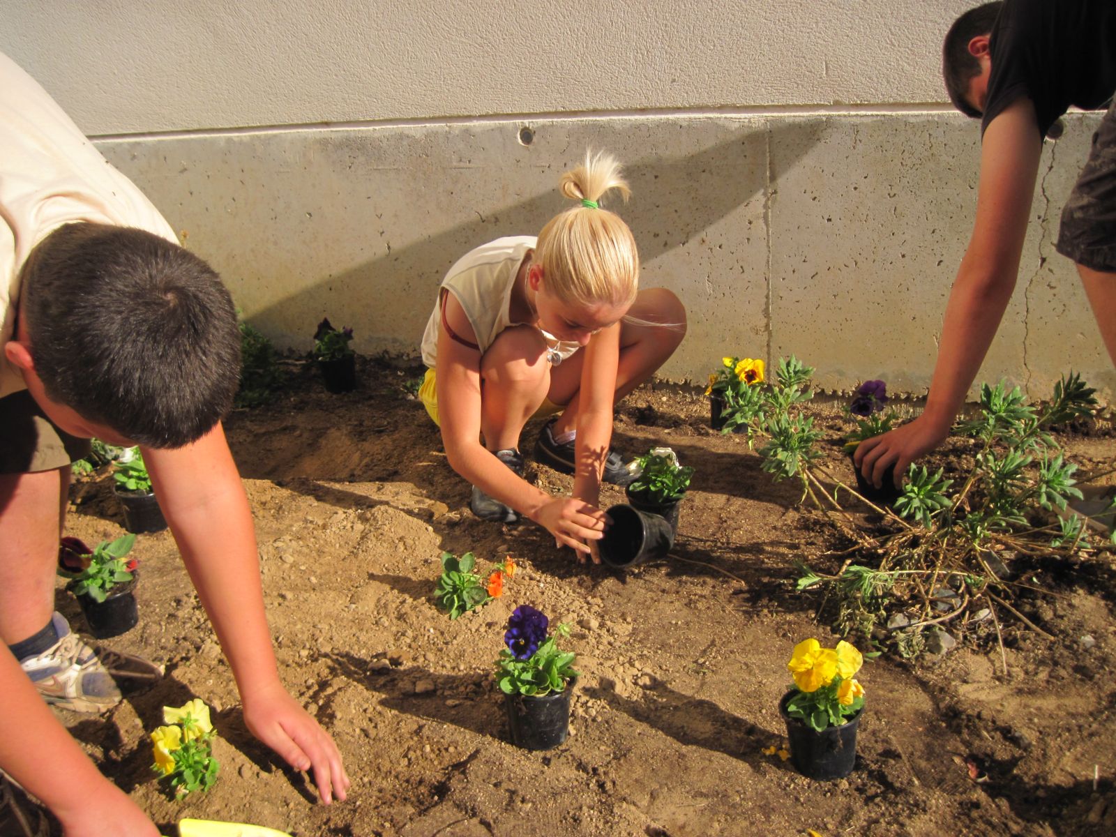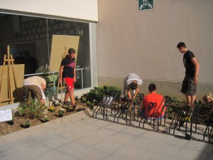 Aqui estàvem plantant els pensaments els llebabem del test i les plantabem al terra uns feen els solcs i els altres els ficaben els pensaments dins, i una vegada acabat vam regar les flors. |