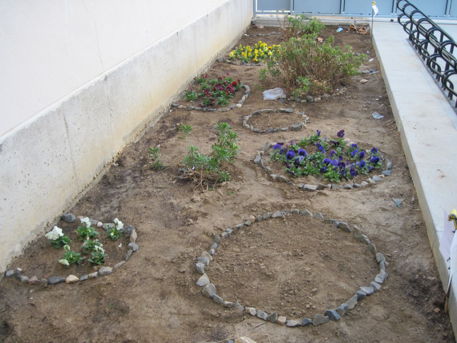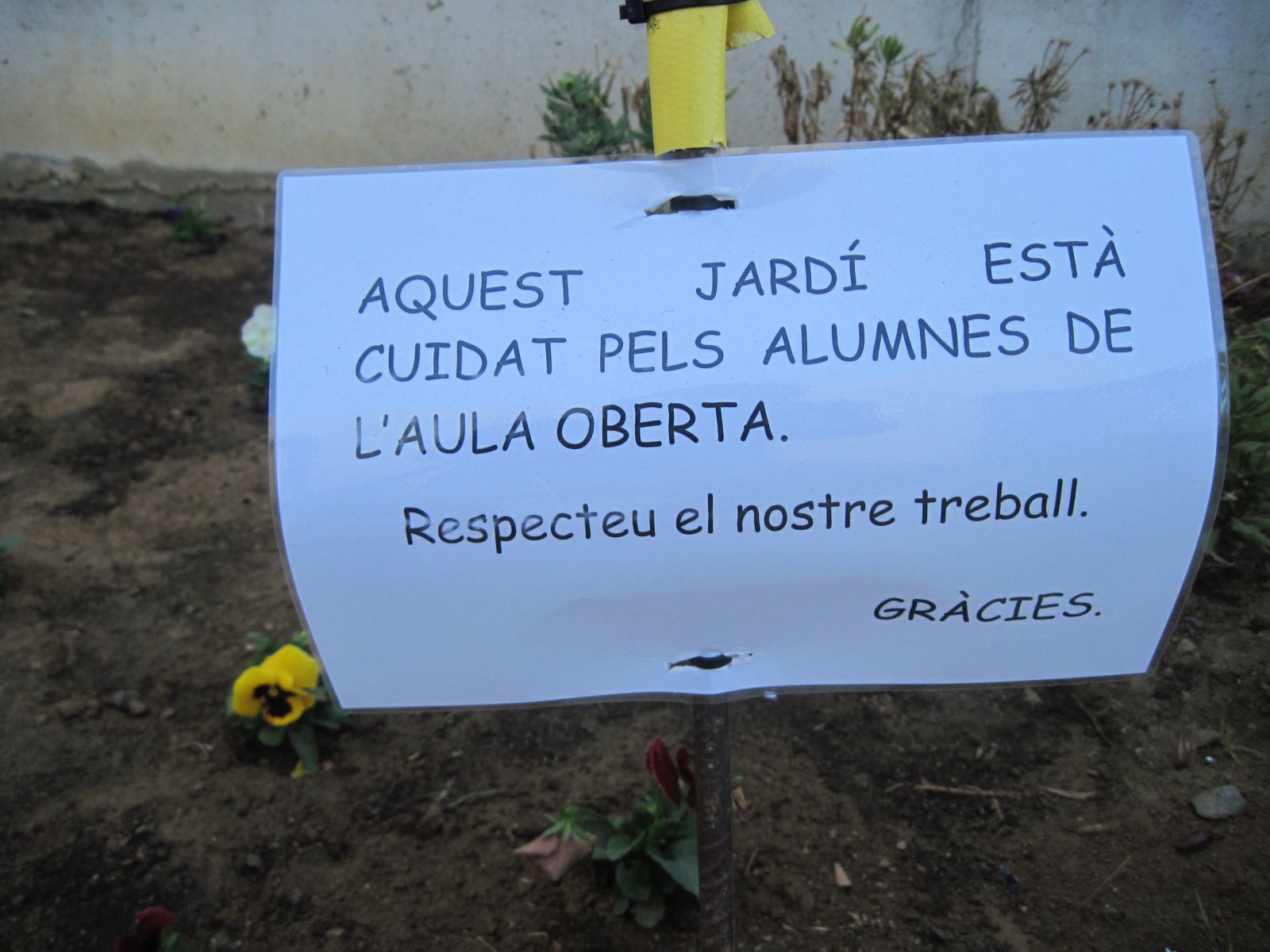 Vam plantar els pensaments escampades pel jardí, però el professor Manel Marquès, ens va dir que féssim rogles amb les flors de cada color (roig, lila, groges) i les que surten a la foto és el resultat de les groges. |