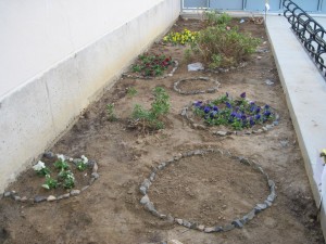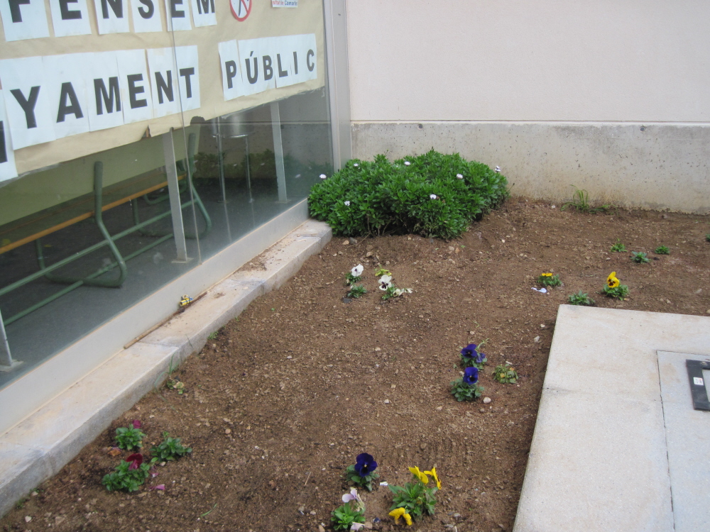 Vam ficar totes les flors juntes per colors. Després vam triar pedres menudes i les vam ficar pel seu voltant.Als rogles que no es veu res hi han tulipes plantades que creixeran a la primavera. |