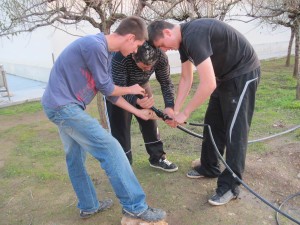 Sergi, Roger i Bartosz arreglant les connexions del goteig. |