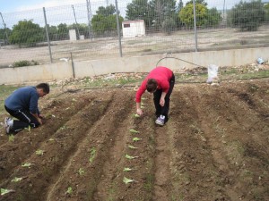 Aquí el Dani Garcia i el Roger Princep estan plantant els enciams. Primer els han repartit per damunt del cavalló. |