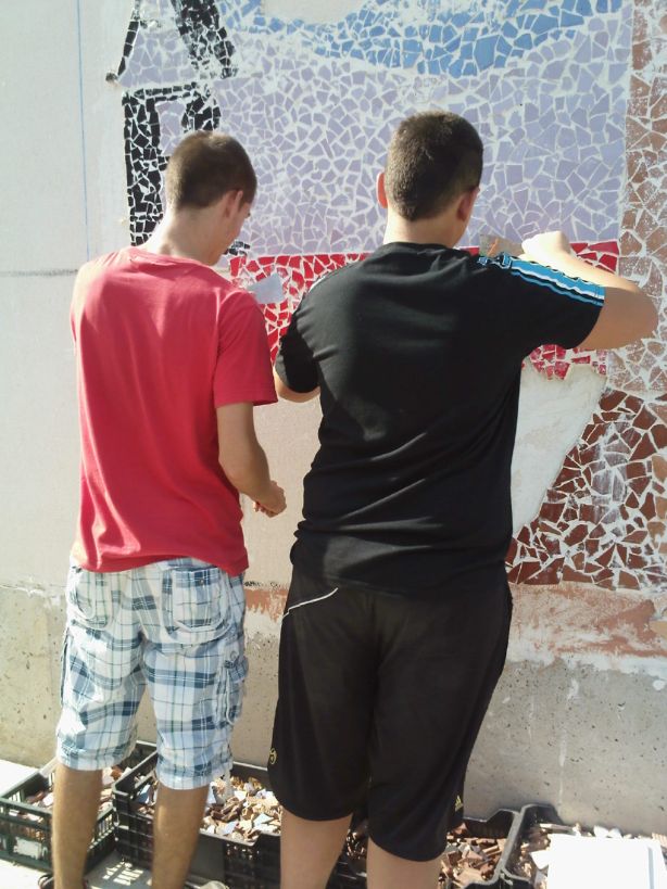 Aqui estan 2 companys de l’aula oberta el Dani i el Sergi fent el mosaic.