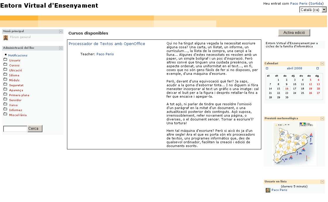 El pròxim curs espere tindre acabada la meua plataforma Moodle per a poder donar classe inclús si estic de baixa, com ara. Uns dels avantatges de Moodle és l’autonomia i la llibertat que ens dóna tant als alumnes com als professors.