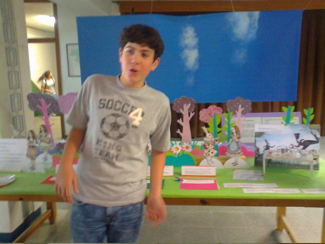 Ante la pequeña exposición se sentaron nuestros invitados, nuestros compañeros de clase ( 2º de ESO) y les hablamos de todo cuanto nos aportó la lectura y de cómo la lectura nos llevó a la escritura. Juntos atravesamos el espejo (como también hizo Alicia) y paseamos por un País de las Maravillas instalado en el vestíbulo del instituto y en nuestra imaginación, siguiendo estos pasos: