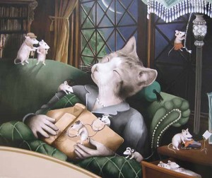 “Després de sopar, la senyora Marlowe es va retirar a la saleta i es va asseure al seu sofà preferit. Amb tots els seus ratolins al seu voltant, es va posar les ulleres i va començar a llegir-los un llibre en veu alta. Mentre llegia , l’oncle Harvey li rascava darrera les orelles…
