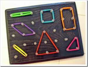 Els nens i les nenes han composat un gat, un os, un cigne i una girafa amb el tangram. També han fet les seves composicions amb els blocs lògics. Han intentat fer la simetria d’una figura donada. Finalment han jugat lliurement amb el geoplà i les gomes.