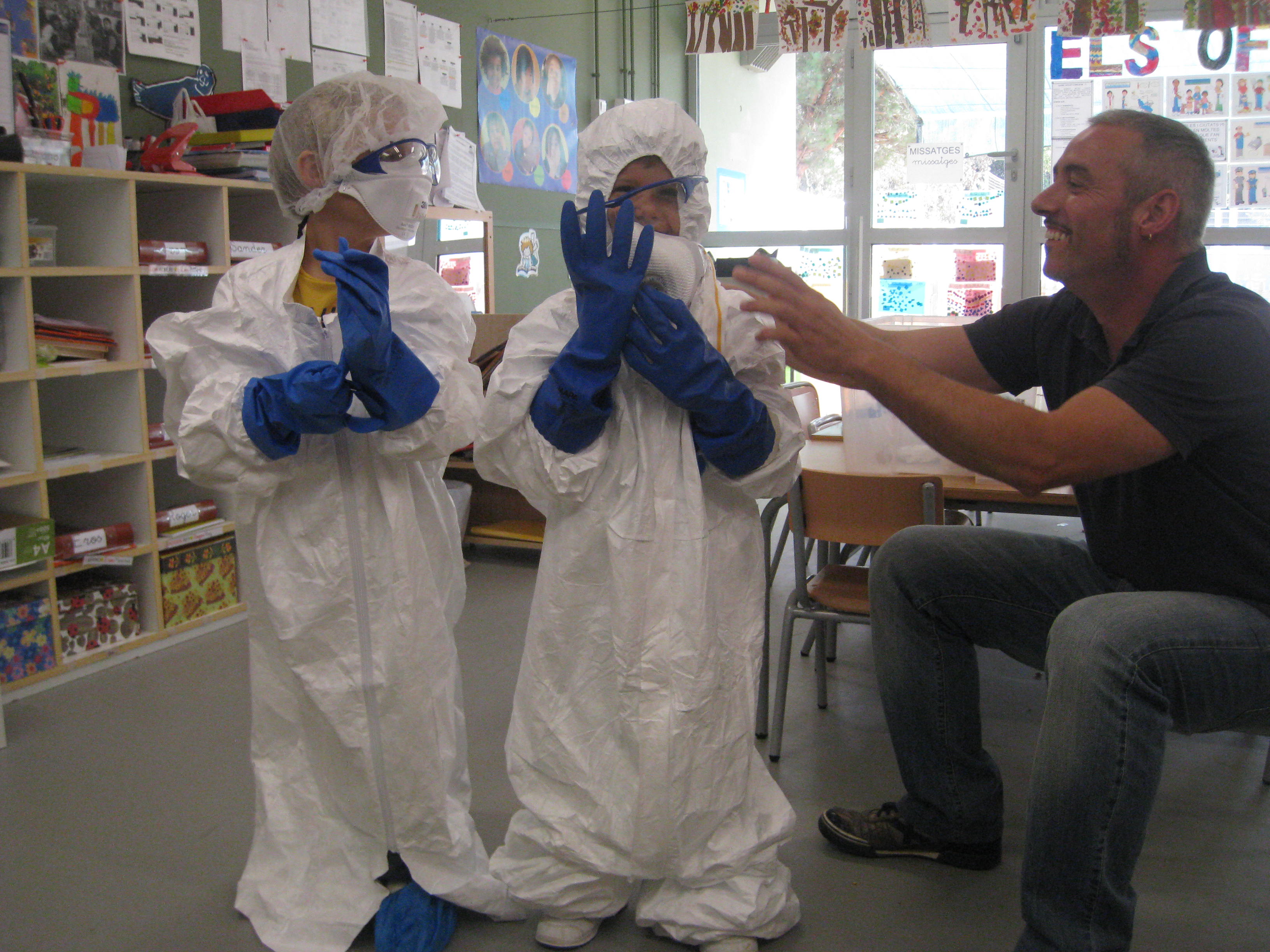 Ara ja sabem que en algunes feines cal anar ben protegit per no fer-nos mal i també perquè el lloc on es treballa ha d’estar molt I molt net. És per això que es posen una vestimenta especial, màscares, ulleres, guants… Nosaltres també ho hem volgut provar! Moltes gràcies David!