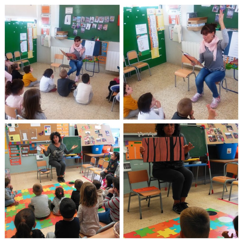 Un dia a la setmana ve, una estoneta, una senyoreta d’una altra classe i ens llegeixen un conte. ens agrada molt i estem molt atents.