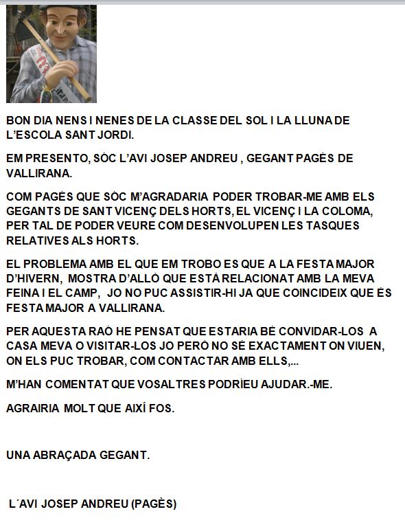 AL VOLTANT DE LA FESTA MAJOR  D’HIVERN DEL NOSTRE POBLE,  QUAN ENS ESTAVEN INFORMANT DE QUE PODIEM VEURE EN LA MOSTRA I EN QUINES ACTIVITATS PODIEM PARTICIPAR , ENS VA ARRIBAR LA CARTA DEL’AVI PAGÉS JOSEP DE VALLIRANA DEMANANT-NOS  AJUDA. NECESSITAVA SABER ON VIVIEN ELS GEGANTS PER TAL DE PODER ENVIAR-LIS UNA CARTA I FINS I TOT VISITAR-LIS PER TAL DE PODER FER-LIS UNES CONSULTES RELATIVES AL SEU HORT. DE SEGUIDA ENS VAN POSAR A INVESTIGAR QUIN SERIA EL LLOC ON PODIEN TENIR LA SEVA RESIDÈNCIA. VAN PENSAR QUE FORA BO  SABER DE QUE ESTAVEN FETS, COM DE GRANS EREN, COM ES TRASLLADAVEN, I ALTRES QÜESTIONS QUE ENS HAN AJUDANT A RESPONDRE FAMILIARS, AMICS, COMPANYS I COMPANYES, MESTRES,….FINS I TOT HEM CONTACTAT AMB LA COLLA GEGANTERA