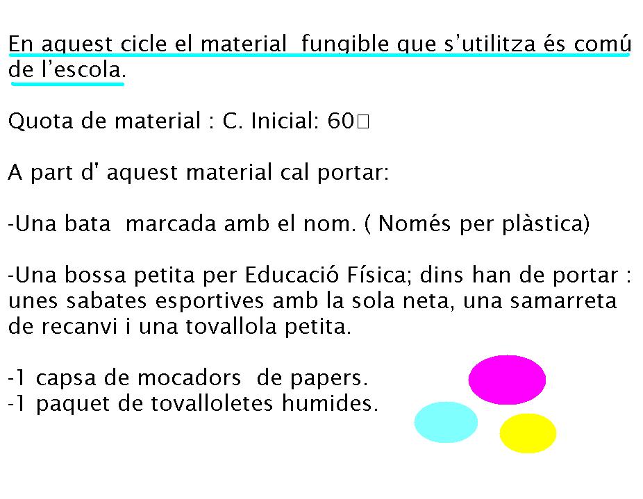 Els alumnes del Cicle Inicial han d’ anar portant per la classe de plàstica: 1 ampolla de plàstic d’ 1’5 litres. 1 Llauna de Nesquik (buida) Gràcies.