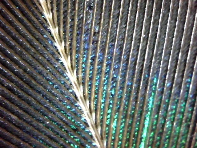 Té diferents colors: Blau fort, blau fluix, gris, verd i groc. Hem vist amb el microscopi digital que les plomes estan fetes d’unes tires de les que surten unes ratlletes de colors..