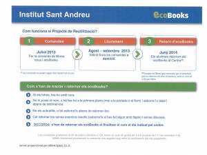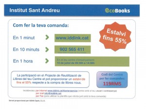 • Aquest curs 2013-14, l’empresa Iddink organitza la venda dels llibres pel sistema Ecobook, amb un substancial estalvi del cost sempre i quan es retorni el llibre en bones condicions. L’empresa Iddink en fa la venda i distribució a domicili dels llibres encarregats: Tf 902 565 411. Adreceu-vos a la pàgina web http://www.iddink.cat/klantenservice