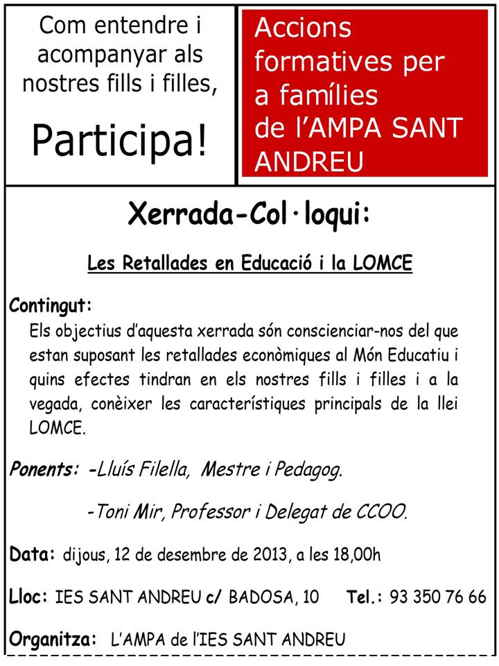L’AMPA de l’Institut Sant Andreu, dins del seu programa d’activitats, organitza una xerrada col.loqui el proper dijous 12 de desembre sobre com afecten les retallades a l’educació dels nostres fills en l’actualitat i en el futur, i com afectarà la LOMCE recentment aprovada pel govern d’Espanya.