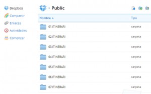 - Dropbox: és una aplicació en línia amb l’objectiu de guardar i/o compartir documents. El seu ús està justificat en el fet que es vols estalviar memòria d’ús a l’hora d’utilitzar els diferents serveis de Google, sempre i quan hi hagi una opció alternativa, com és el cas, substituint parcialment Drive per Dropbox. Pel que respecta a la seva organització, està feta en carpetes també nomenades (fig. 3).