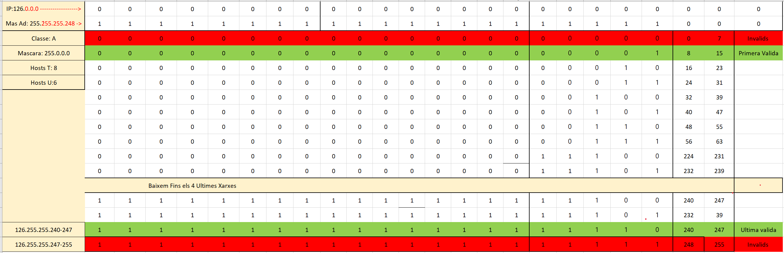En el video anterior podem observar que la xarxa 126.0.0.8 (GateWay) i la 126.0.0.15 (broadCast) estan reservades per la xarxes donant un total de 6 hosts utils començant des de la 126.0.0.9 fins a la 126.0.0.14