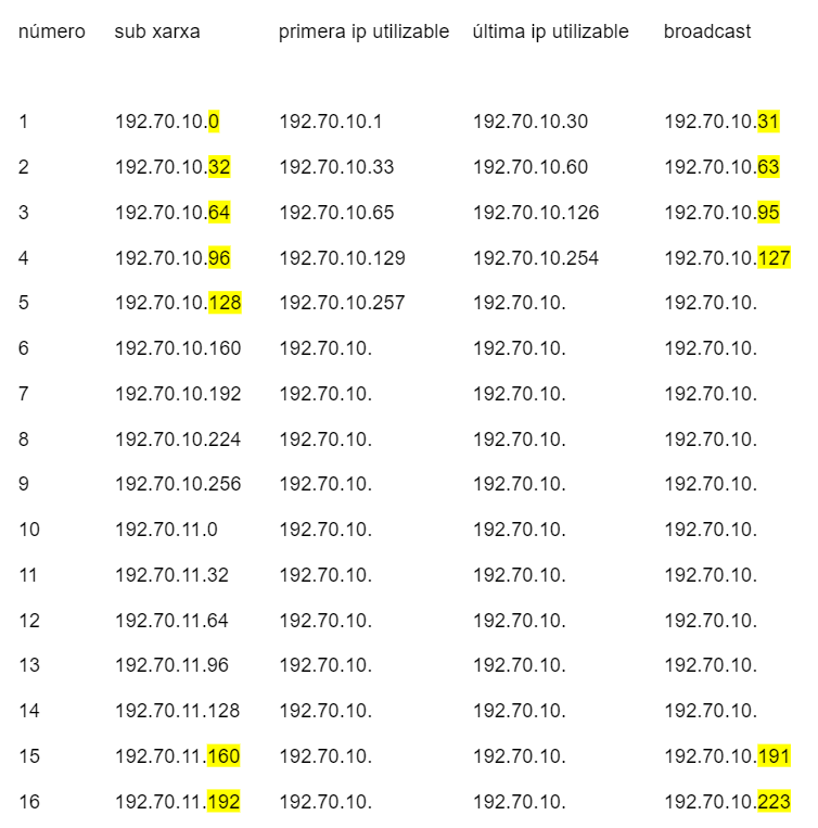| Màscara de subxarxa (adaptada) | 255.255.255.240 |