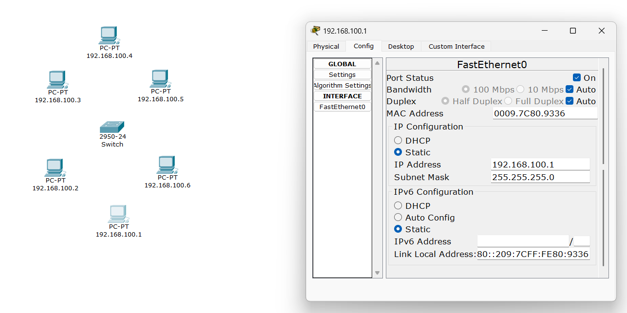 - PC-0: 198.168.100.1/Subnet mask: 255.255.255.0