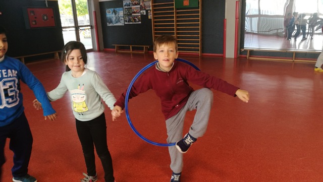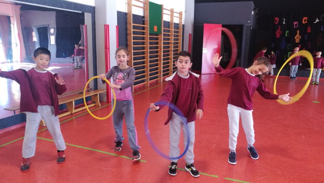 Des d’educació física els alumnes de 2n estem preparant un espectacle de circ i per això hem estat treballant diferents reptes d’habilitats motrius diverses: saltar, fer malabars, activitats gimnàstiques i fer rodar el hula-hoop.
