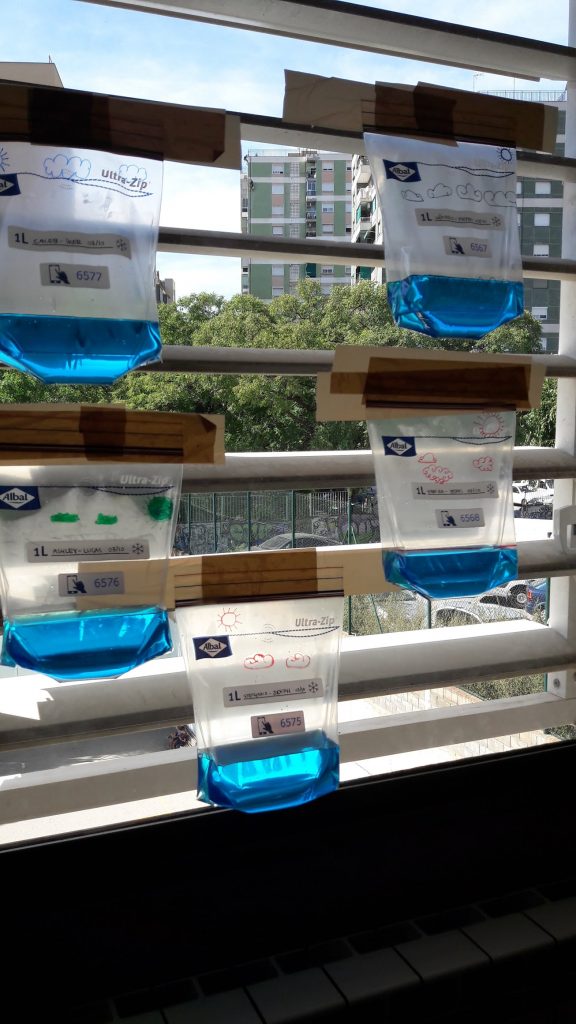 Els nens i nenes de 4t hem decidit fer un experiment dins l’aula per poder observar en primera persona què passa amb el cicle de l’aigua. Per poder-ho fer vam omplir diferents bosses de congelació amb aigua amb colorant blau. A les bosses hi havíem dibuixat prèviament una línia per representar el mar, núvols i el sol. Vam enganxar les bosses a les finestres de la classe i vam escriure una hipòtesis explicant què crèiem que passaria a partir d’aquell moment.