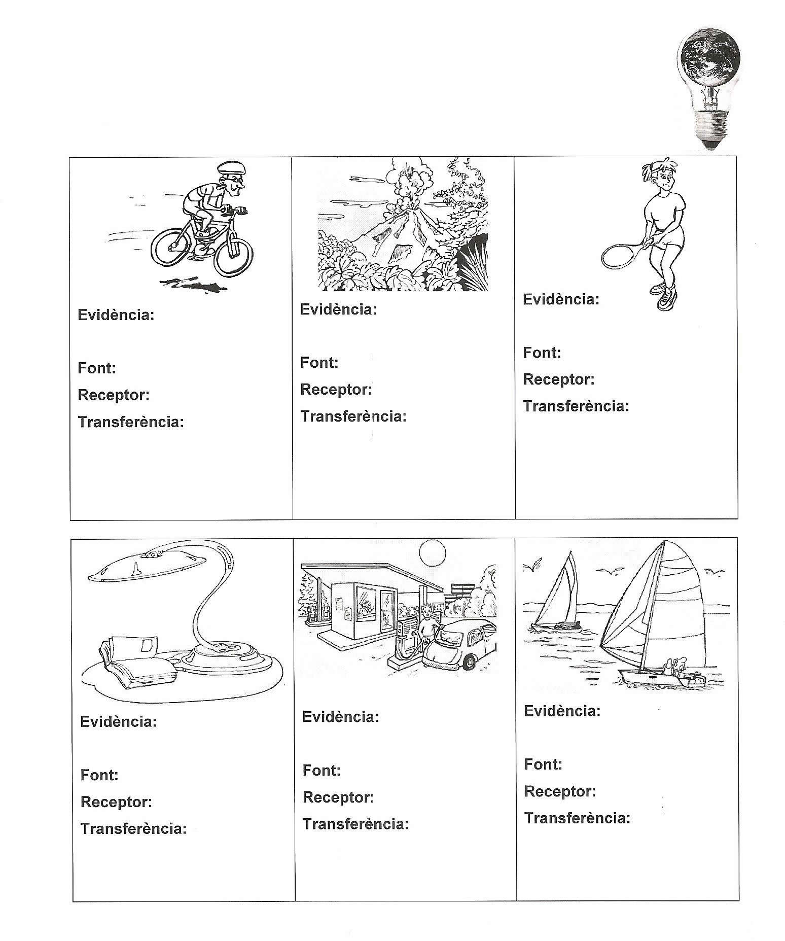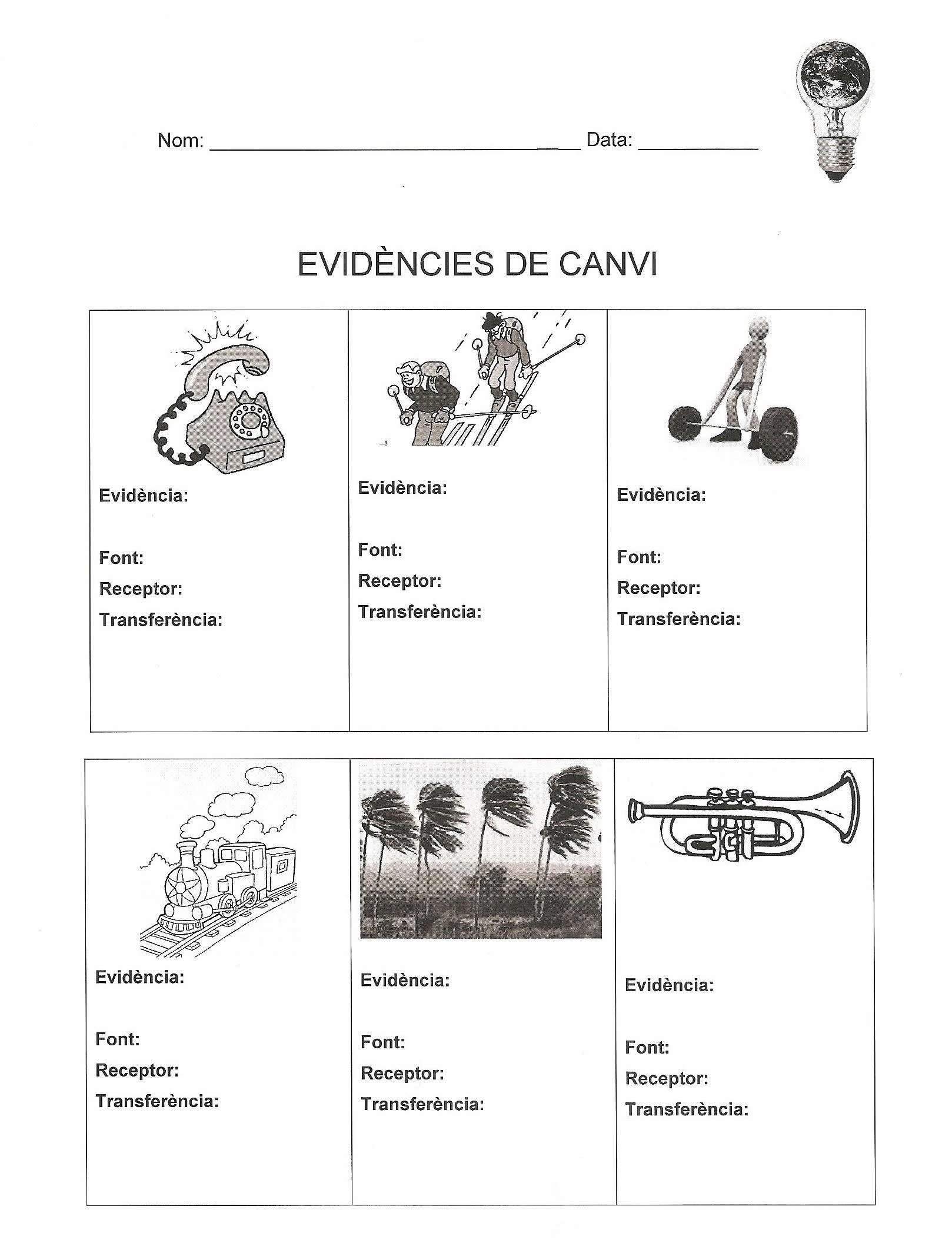 Les evidències de canvi. La transferència d’energia implica un canvi, aleshores amb unes làmines projectades a la pissarra digital anem a comprovar quins són els canvis que es donen en elements quotidians com poden ser el so del telèfon, un dia ventós o anar amb bicicleta. Després de treballar-ho tot el grup classe, individualment completarem una fitxa a l’entorn de les evidències de canvi.