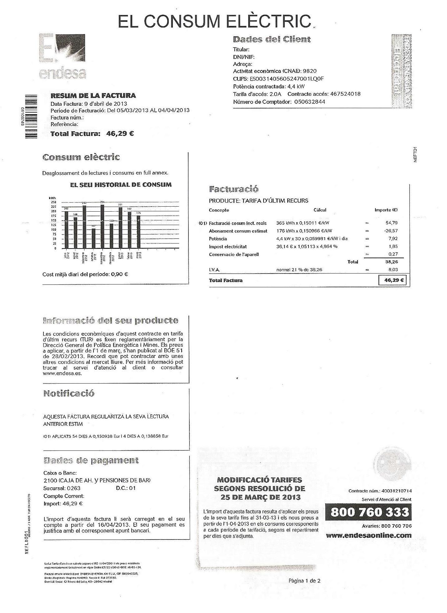 Per completar l’activitat de la sessió anterior, analitzarem una factura de consum domèstic d’energia elèctrica: quin és el període facturat? quina és la potència contractada? quin és el consum real? quant val un kWh? en quins apartats es deglossa una factura d’electricitat? hi ha alguna despesa fixa?