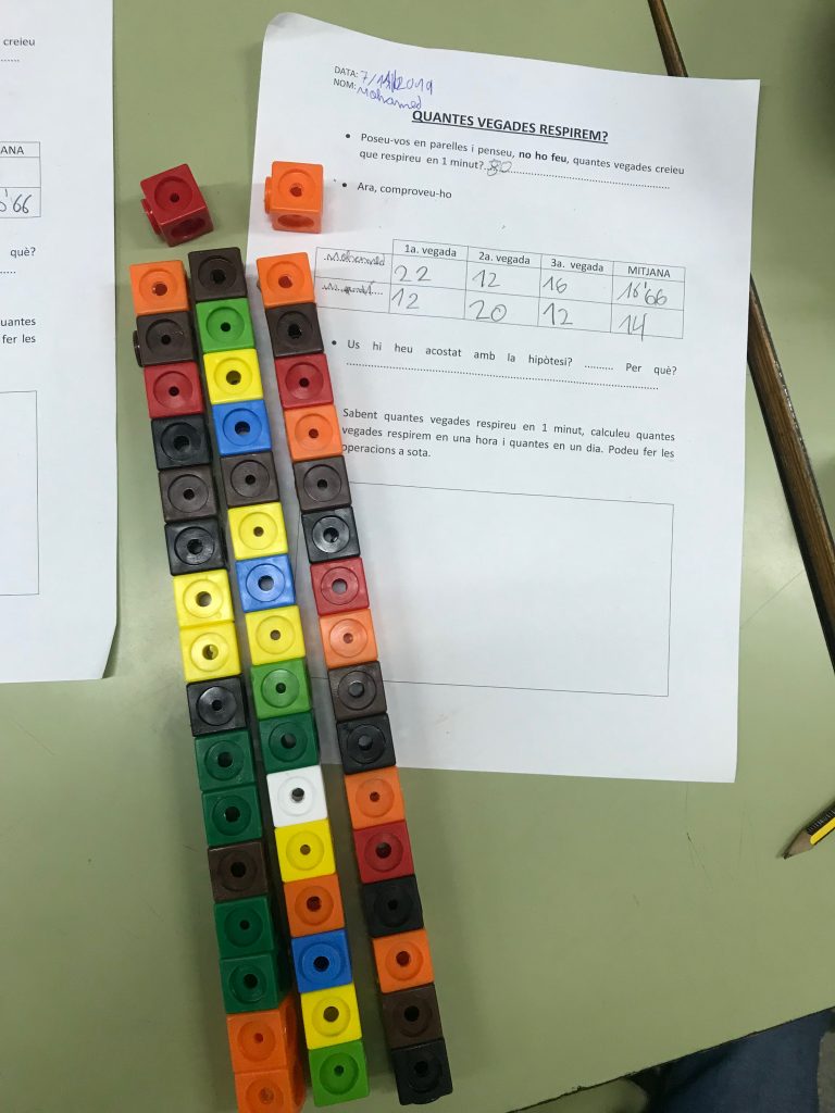 Els i les alumnes de 4t de l’IE Barnola, dins el projecte com expulsem els gasos, hem estat treballant com calcular la mitjana. Per poder-ho representar de forma visual, ens va anar molt bé utilitzar el material dels multicubs.