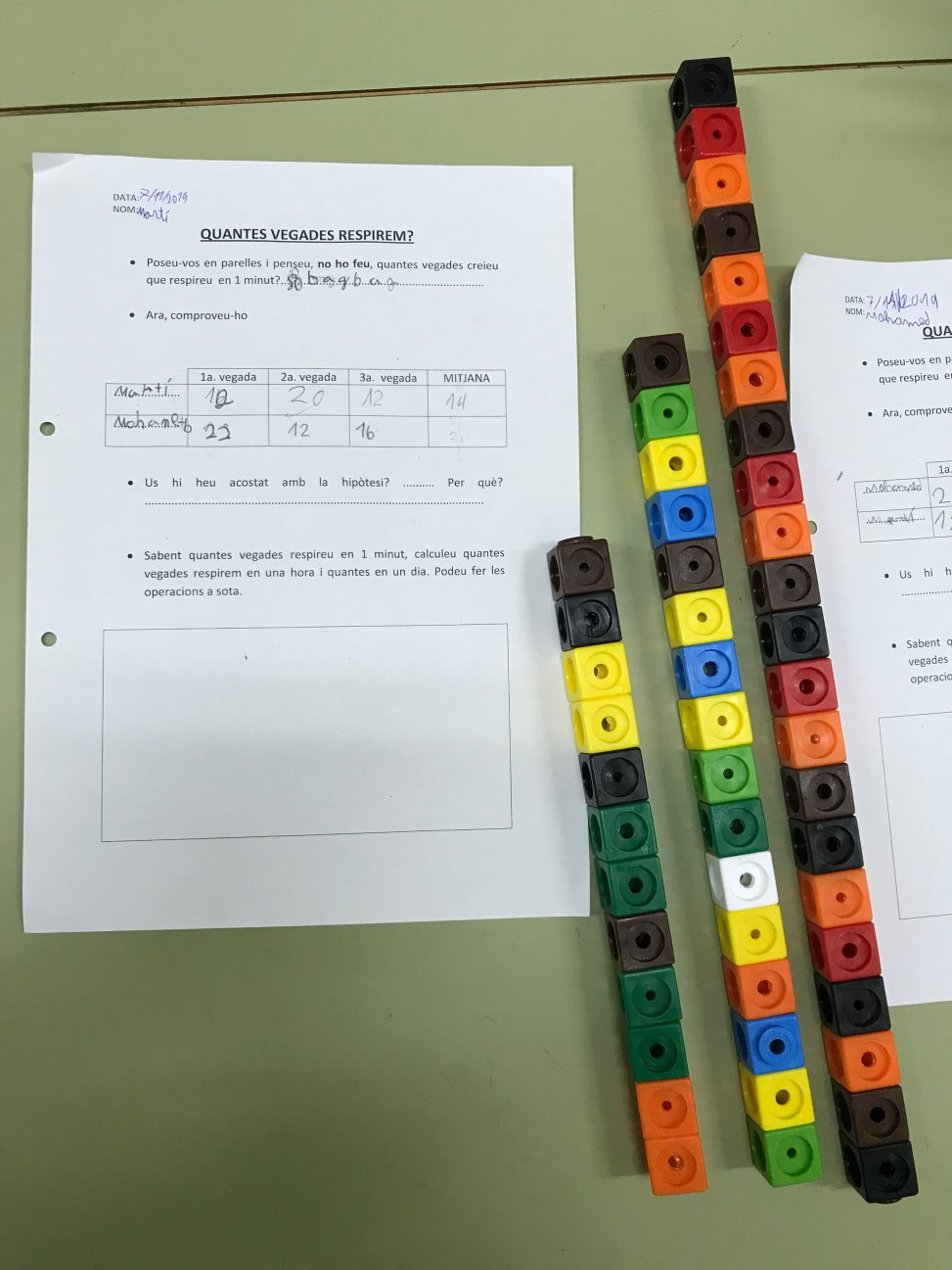 El repte era calcular quantes vegades respirem en un minut, per tal que fos el més real possible, per parelles vam comptar quantes respiracions fèiem en 1 minut 3 vegades i, a partir d’aquests resultats (que van ser variables), vam calcular la mitjana.