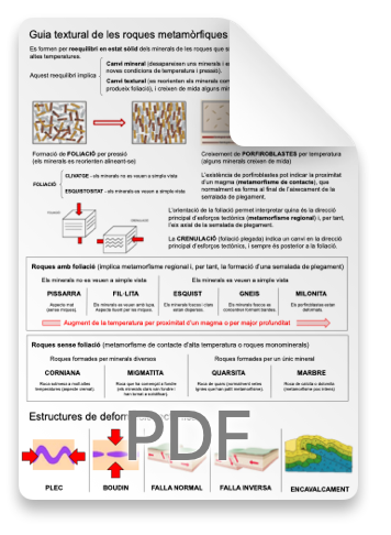 Aquesta guia és una ajuda al reconeixement de textures habituals en les roques metamòrfiques. Més enllà dels noms concrets de cadascuna de les roques (que poc interès aporta en sí mateix), el que realment importa és ser capaços de reconèixer les seves textures i interpretar, en base a elles, els processos geològics que s’han anat succeint.