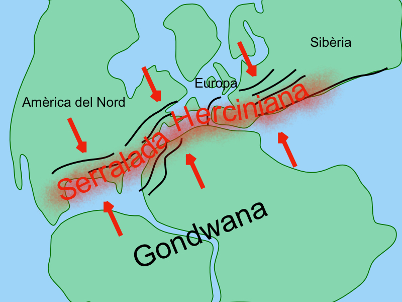 La col·lisió tectònica entre el supercontinent Gondwana i altres subcontinents (el que ara és Europa, Sibèria i Amèrica del Nord) durant el Carbonífer va tenir com a conseqüència la formació d’una gran serralada de plegament, la serralada Herciniana.